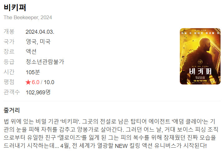 개봉한지 조금 지난영화지만 뢔 이제야 봤지 하는 후회가 들 정도에 스토리짱짱하고 액션또한 말이 필요 없는 압권 그 자체입니다 꼭 들 한번 보세요 오랜만에 영화다운 영화 받아서 행운입니다