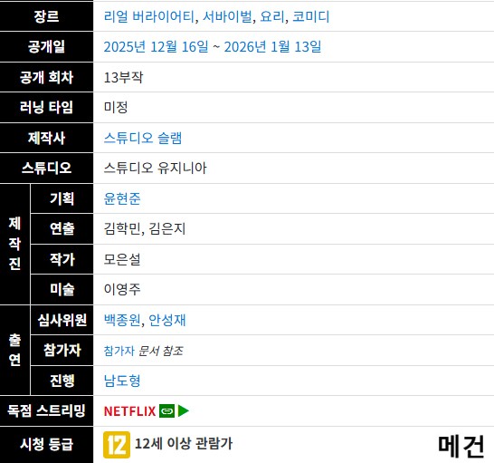 • [N] 흑백요리사 시즌 2. 8화~10화. (2025.12.30.) 13부작 예정